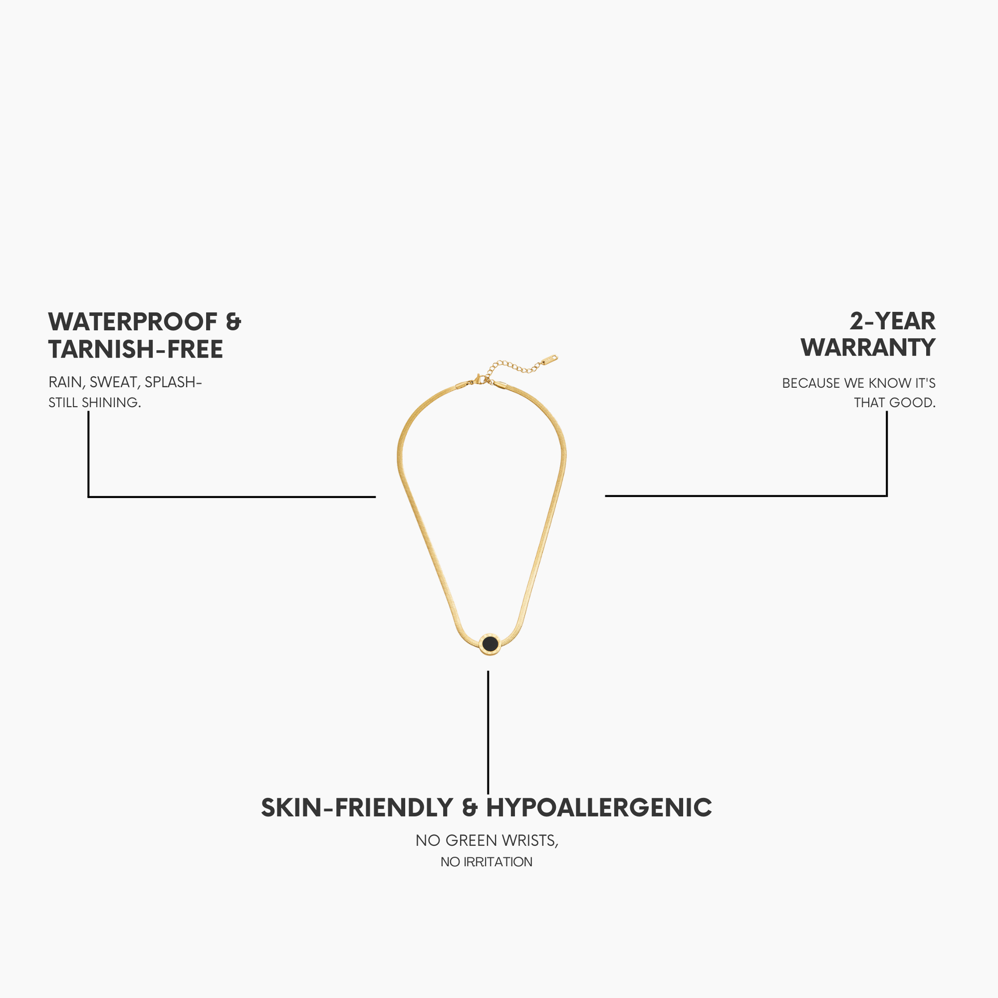 The Azalea Black Pendant Necklace combines sleek geometry with timeless charm. Its glossy black disc centerpiece framed by engraved Roman numerals exudes sophistication — perfect for those who appreciate minimalism with a touch of luxury.