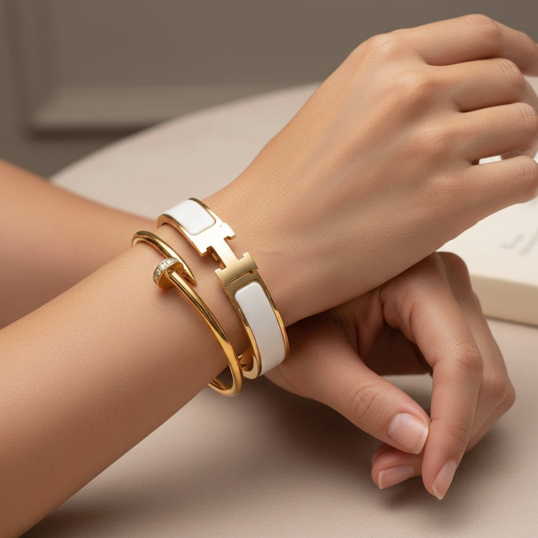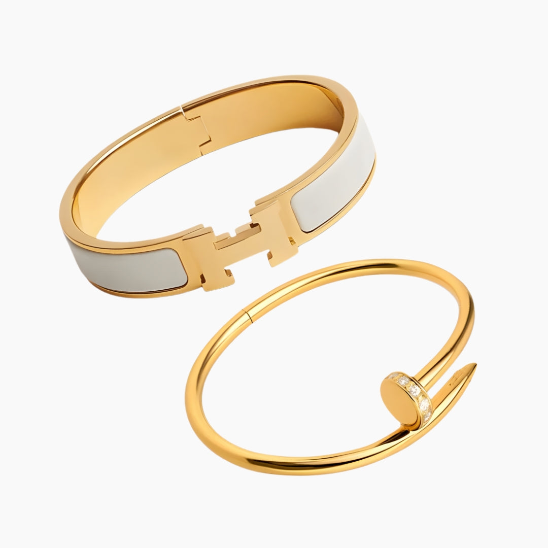 Elevate your wrist game with the Helene Deluxe Bundle — a refined duo that blends sleek sophistication with bold modern design. Perfect for stacking together or wearing individually, this set adds effortless elegance to any occasion.