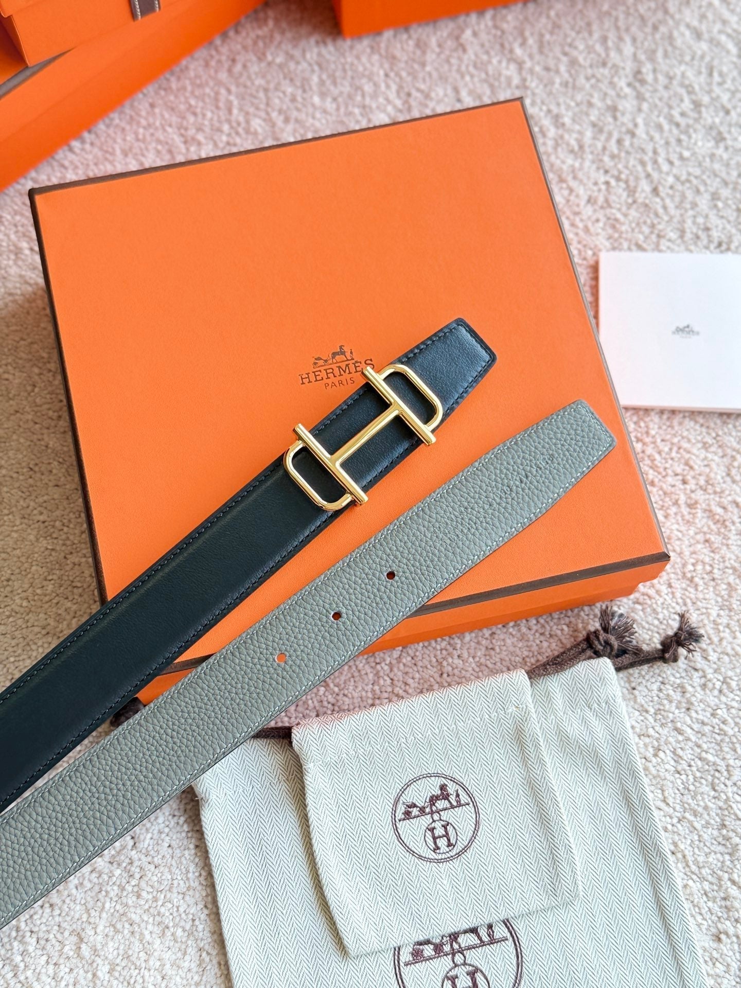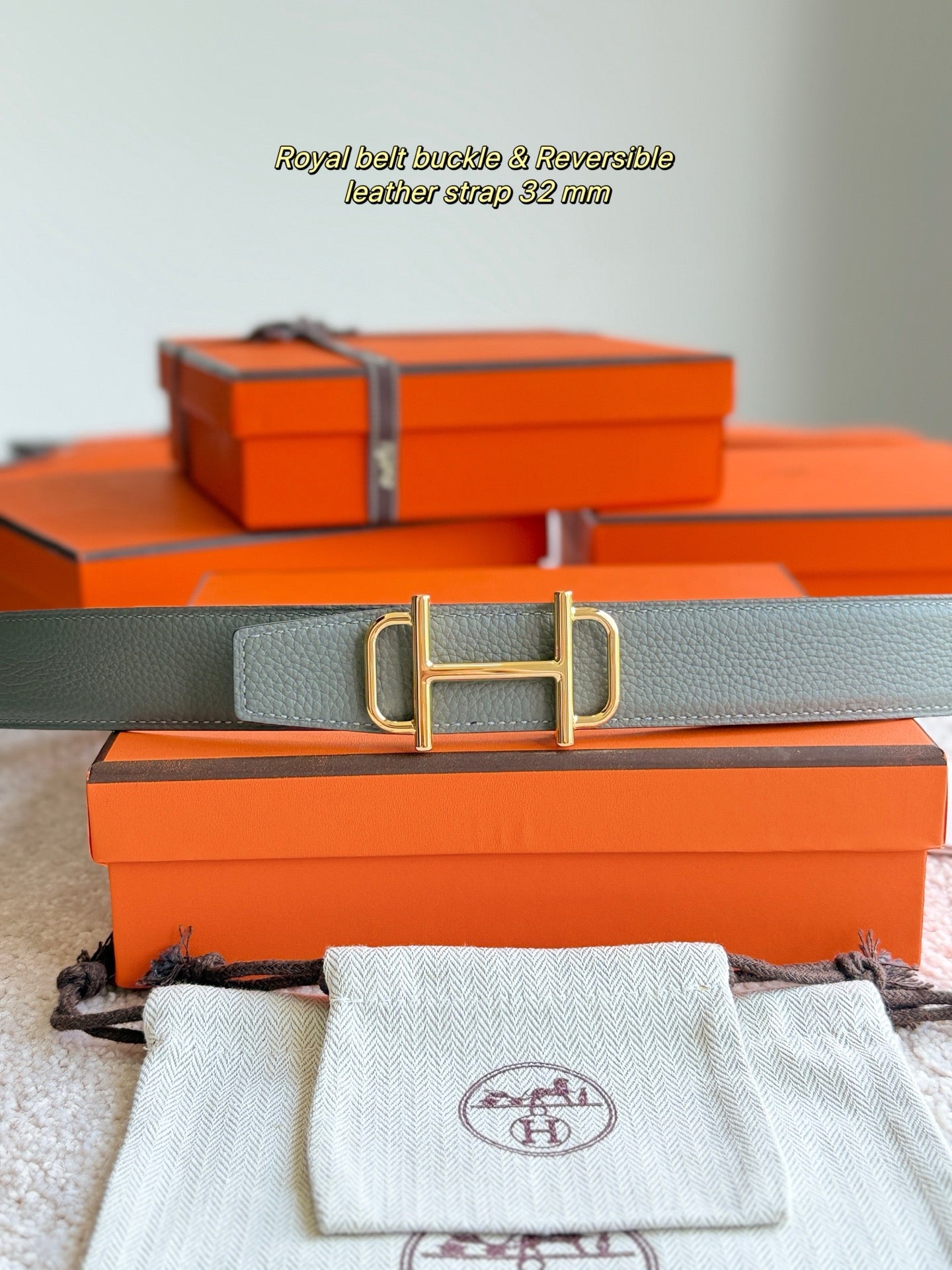 HELENE ROYAL LEATHER BELT — GRAY & BROWN (GOLD HARDWARE, 32MM)