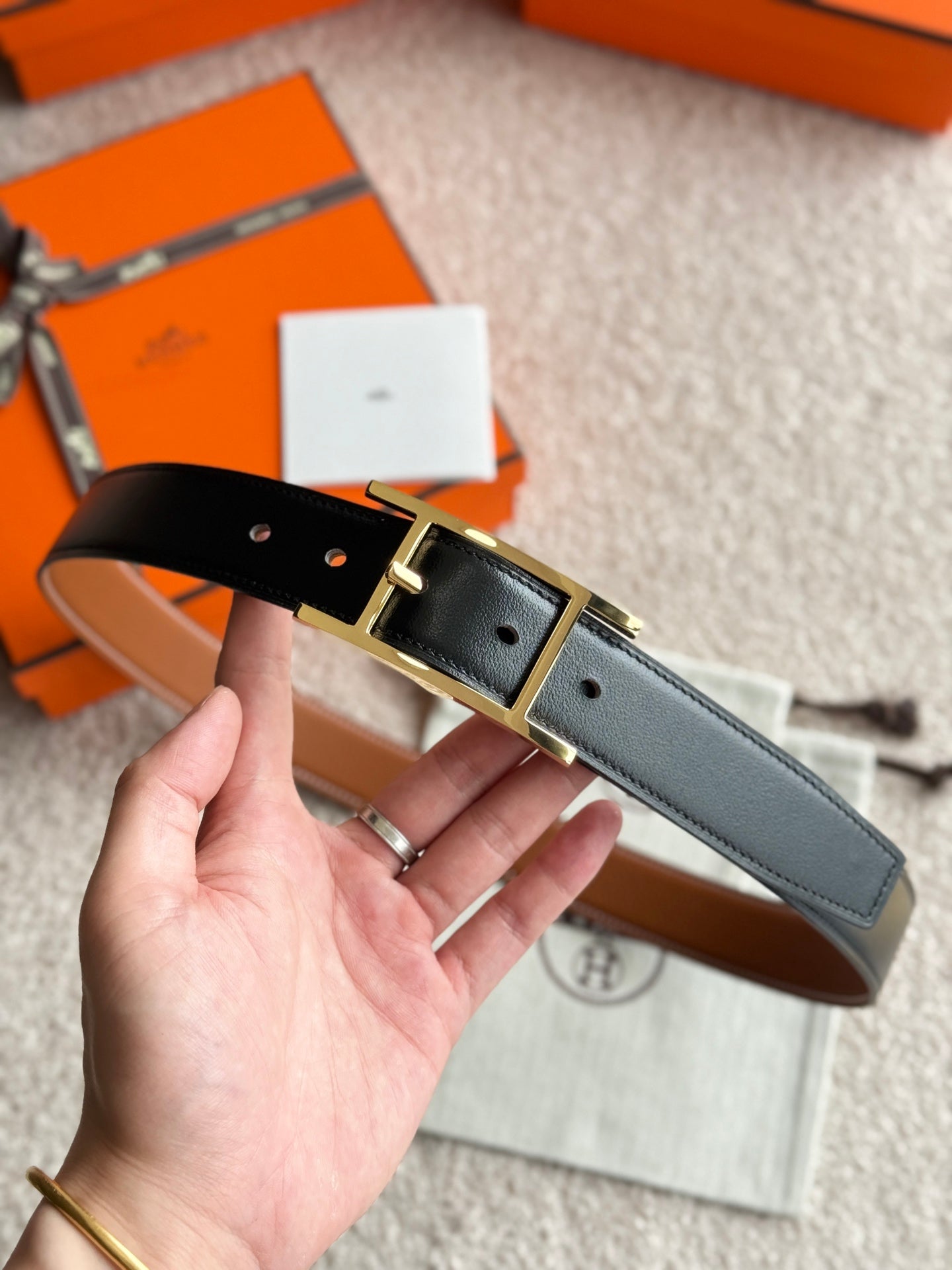 HELENE QUENTIN REVERSIBLE LEATHER BELT — BLACK & BROWN (GOLD HARDWARE, 32MM)