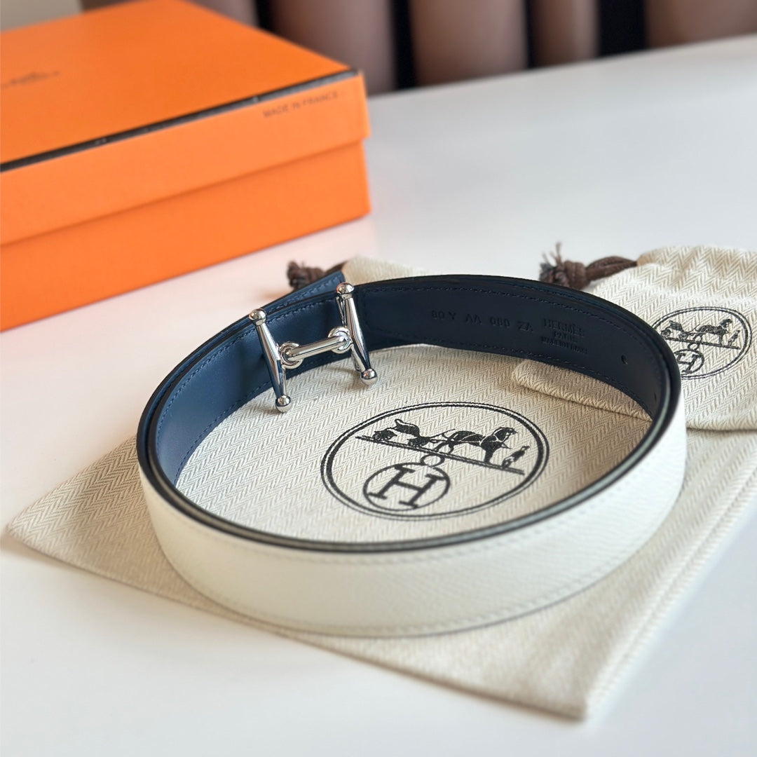 HELENE MORS H REVERSIBLE LEATHER BELT — BLUE & BEIGE (SILVER HARDWARE, 24MM)