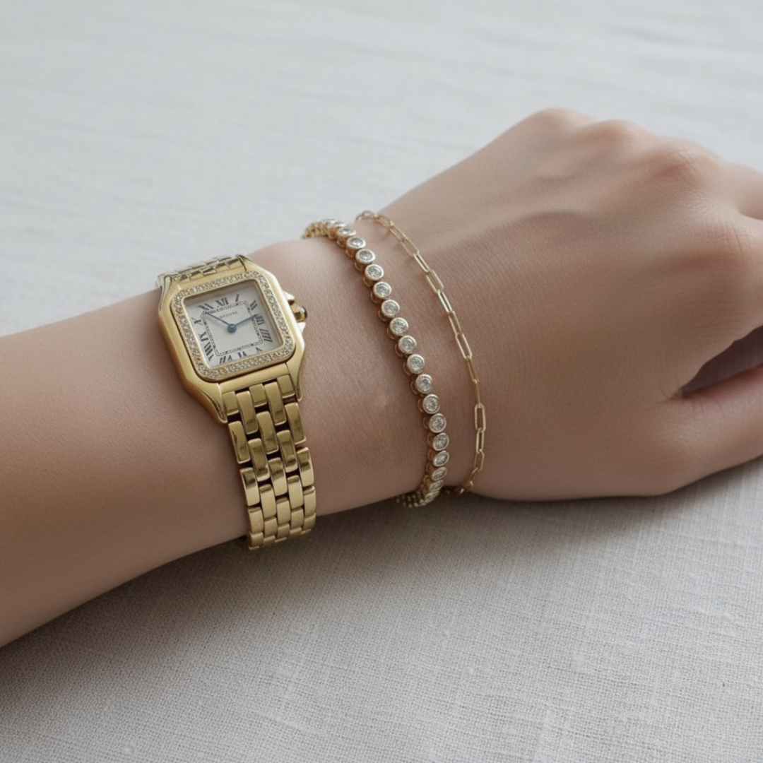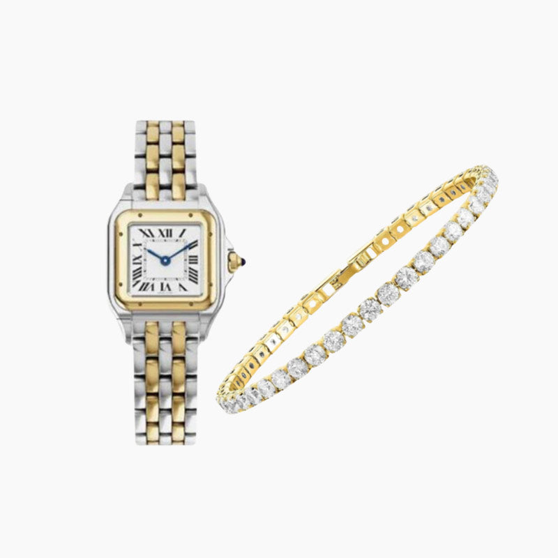 The watch embodies precision and poise, designed with a refined silver-and-gold finish that transitions seamlessly from day to evening. Complementing it is the tennis bracelet, adorned with sparkling stones that shimmer with every movement — a symbol of grace and confidence.