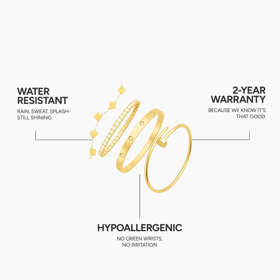 18K Gold plating on surgical steel. Engineered to stay brilliant, always.